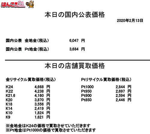 (金プラチナ混合製品は精錬費として、g=200円引かせて頂きます)