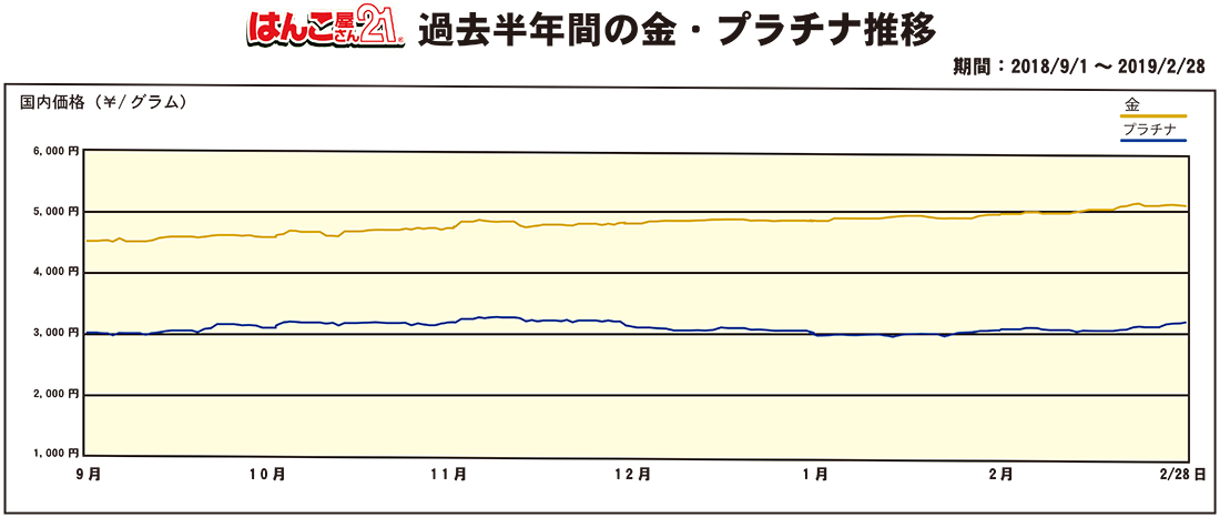 過去半年間の金・プラチナ買取り価格 価格変動グラフ